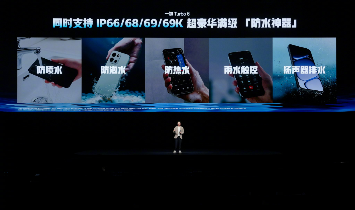 一加 Turbo 6 成功通过 7 大严苛军标测试,搭载旗舰级防水架构,支持 IP66/68/69/69K 满级防水,采用了旗舰级抗摔架构,屏幕覆盖超抗摔晶盾玻璃,耐摔性能提升 160%,支持 1.5 米高度防摔。